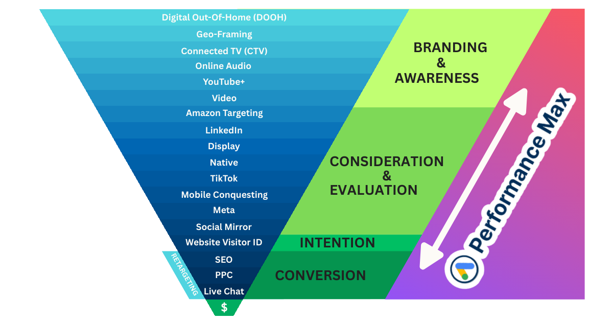 Each product in your Vici toolbox is designed to reach people in different places in the funnel and at different stages of their customer journey. Understanding this from a strategic point of view is powerful when making campaign recommendations and reinforcing why you have those recommendations. Because of this, we have created a digital sales funnel slide in the “more info” section of your client capabilities presentation that looks like this: