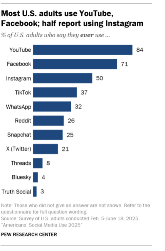 Instagram continues to grow as well, with roughly half of U.S. adults now using the platform, up significantly from just a few years ago. Threads, while still in its early stages, has begun to carve out a niche among younger users, though adoption remains modest compared to Facebook and Instagram.