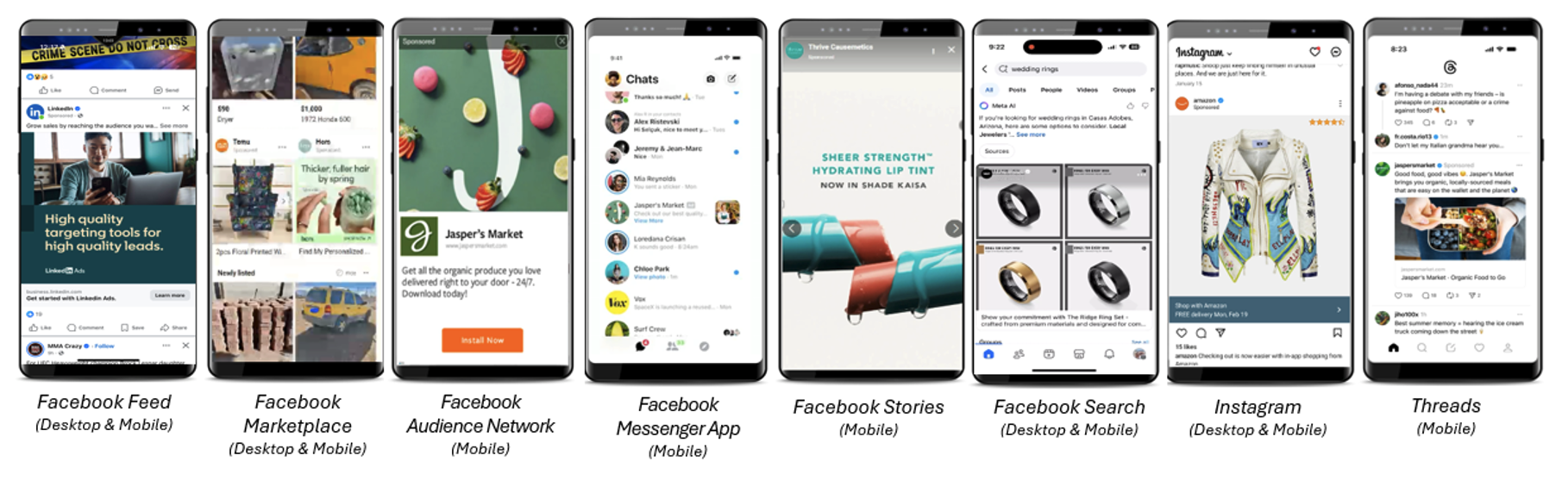 Meta ads appear across Facebook and Instagram feeds, Stories, Reels, Messenger, and Audience Network placements. This cross‑placement delivery allows Meta’s algorithm to optimize toward the placements and environments most likely to drive results.